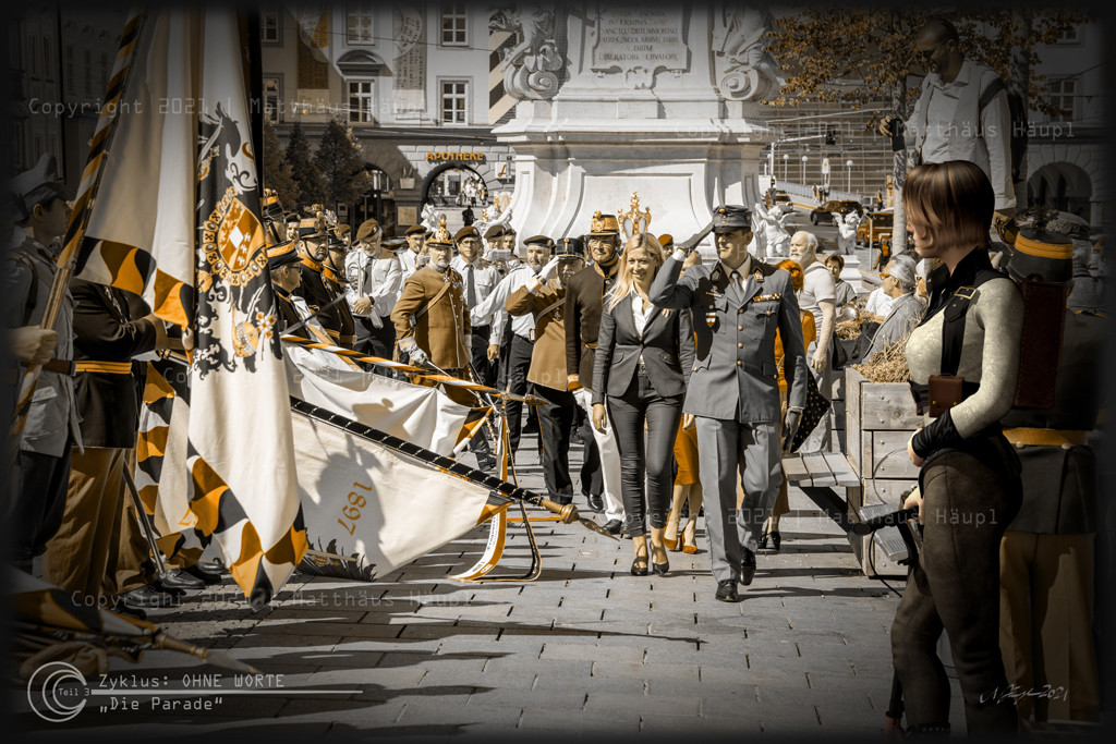 Als alle mit ihren Reden fertig waren, bildete sich eine kleine Gruppe, angeführt von einem Soldaten, die sogleich salutierend die einzelnen Reihen abschritt. Die Träger der einzelnen Fahnen senkten diese, sobald die Gruppe an ihnen vorbeikam. Danach marschierten alle Soldaten im Gleichschritt vom großen Platz. Vorne weg immer die jeweilige Fahne der zugehörigen Gruppe. Es war wunderschön anzuschauen und irgendwie hatte es etwas von einer längst vergangenen Zeit. Das hat aber nichts damit zu tun, dass die meisten der Soldaten eher ältere Männer waren. Vielleicht waren ja einige von ihnen damals wirklich mit solchen Uniformen im Einsatz. Doch das glaub ich nicht.